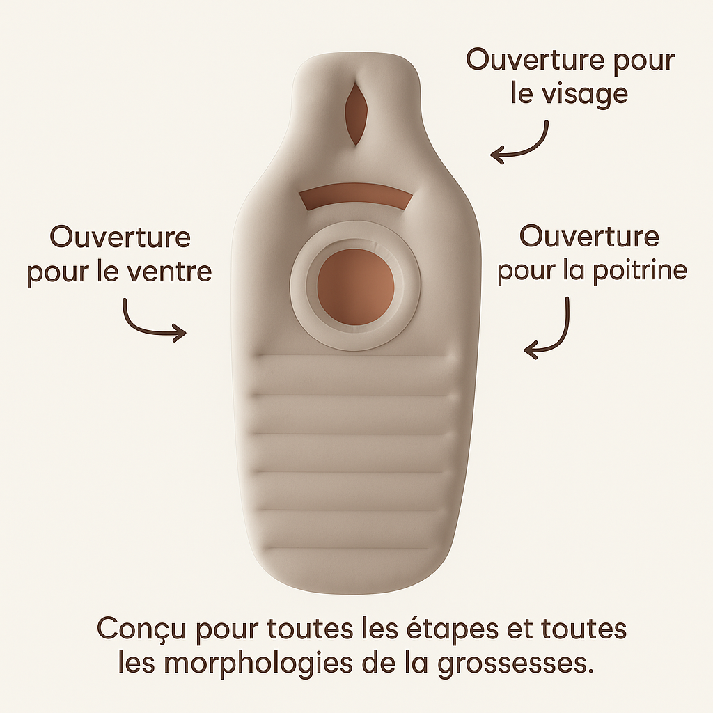 Oui ✅ Il a été spécialement conçu pour les futures mamans. Les ouvertures soutiennent le ventre, la poitrine et le dos sans pression, pour un confort et une sécurité optimaux.